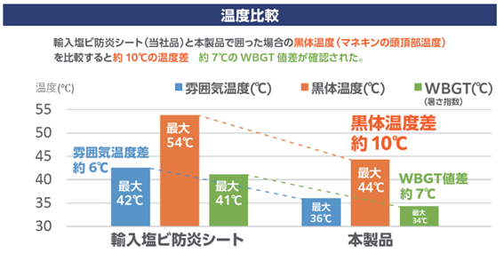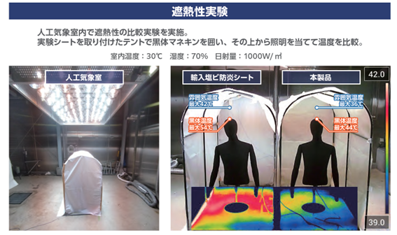 人工気象室内で実施した遮熱性比較試験では、従来の輸入塩ビ防炎シートと比較し、マネキンの頭頂部温度で約10℃、暑さ指数WBGT値では約7℃の低減効果を確認しました※。